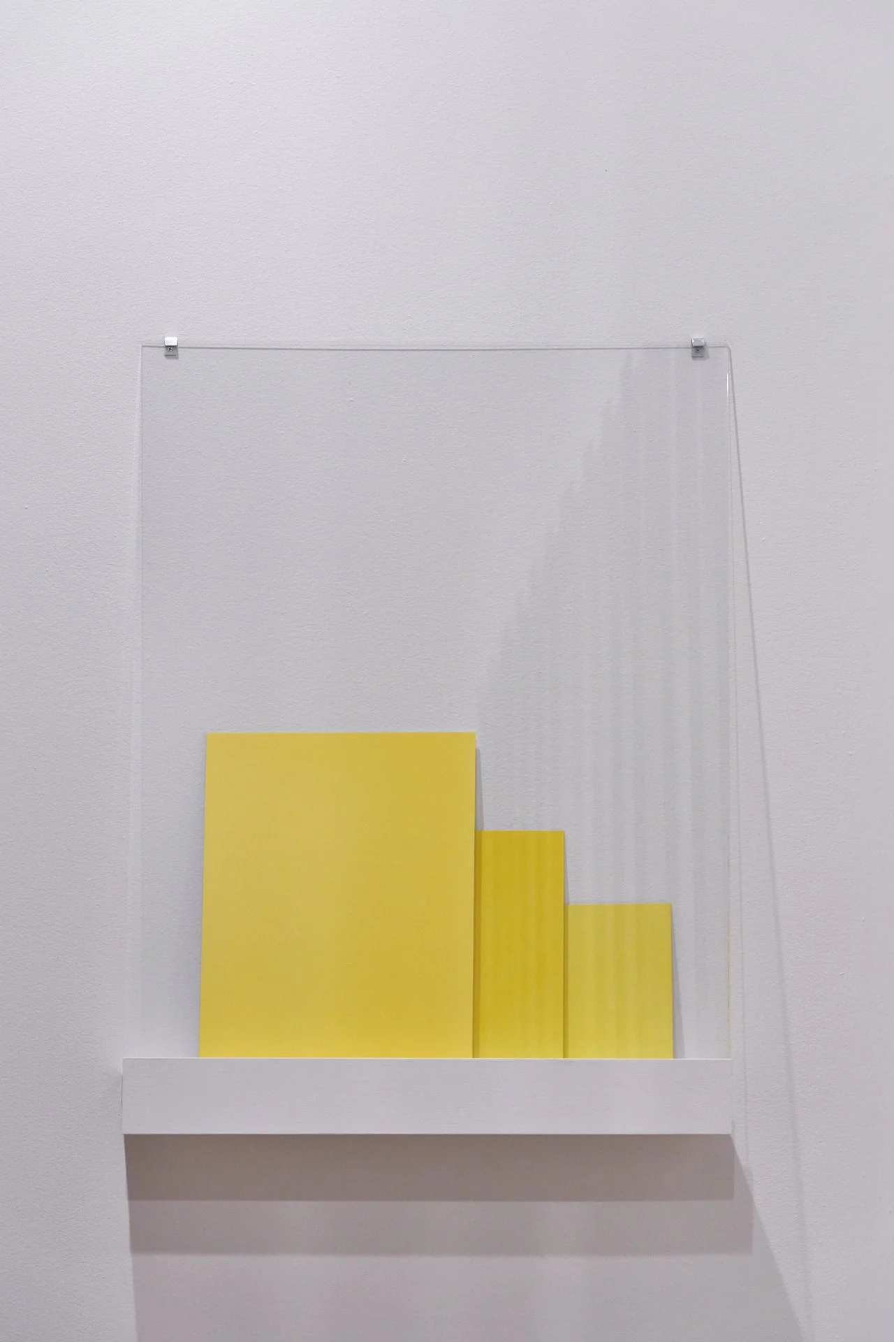 The vertical photograms in the three bays down the museum corridor correspond to the three frame rates (12, 16, and 18) and are intermixed in the installation. The works are all 60 inches high and ranging in narrow width. While each bay represents a second of cinematic time, within each bay (or second) the rates change, so that each bay has photograms corresponding to 12, 16, and 18 frames per second and are intermixed in the installation with, so that each section represents a second of cinematic time and within each bay (or second) the rates change. These photograms are bookended with two works. At the start of the installation is “Untitled (Gorilla Glass Yellow 90), 2023” a yellow UV-cured inkjet on glass and stainless steel that hangs from the dividing wall. At the end of the bays rests “Study Shelf, 2024-2025”, three yellow Kodak dye-transfer works varying in sizes mounted and leaning on a shelf and protected by a sheet of glass.