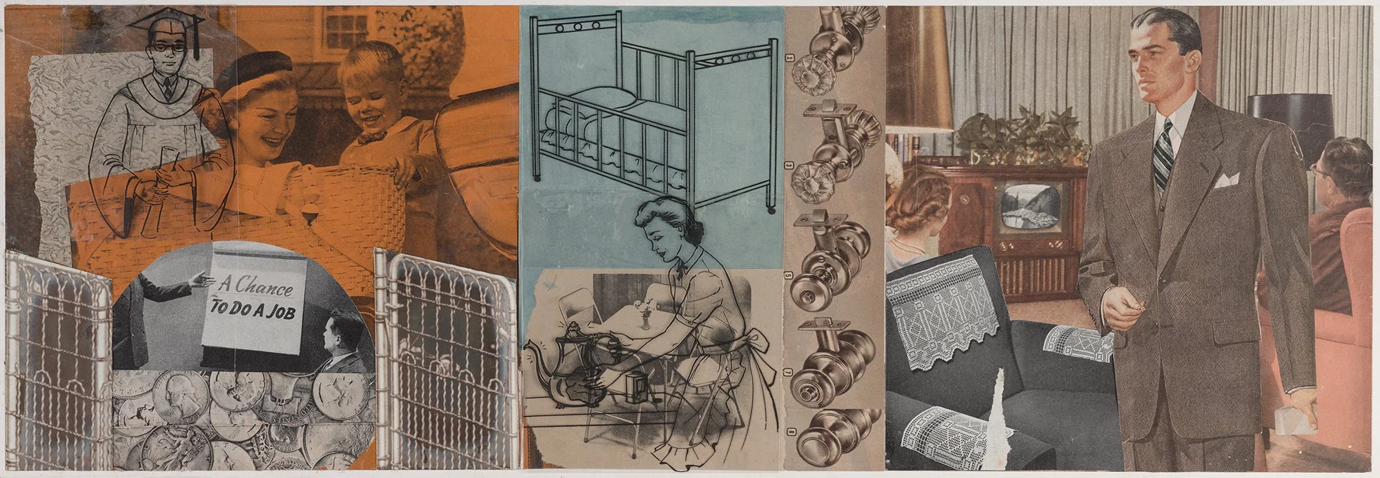 Colleen and Kathleen’s lives and work were so intertwined it is difficult to separate them a quarter century later. Kathleen’s work primarily consists of applied collage made of clippings from print media and catalogs. The collages are directed at the methods by which the capitalistic enterprise enforces stereotypical roles on women to encourage and solidify their homebound consumer status. An image like one in the series “How We Learn, How We Grow (1979-1981)” features a man and woman as central elements, functioning as twin pillars in the composition. They resemble figures from an educational publication. The heteronormative nuclear family is conflated with the capitalist insistence on social class climbing. Around the figures are collaged words like “Tiffany,” and images of silver spoons that intimate how people learn hierarchical social structures and grow from cradle to grave through consumption aiming toward luxury. As a collage it pays homage to Barbara Kruger, Robert Rauschenberg, Hannah Hoch, and Max Ernst.