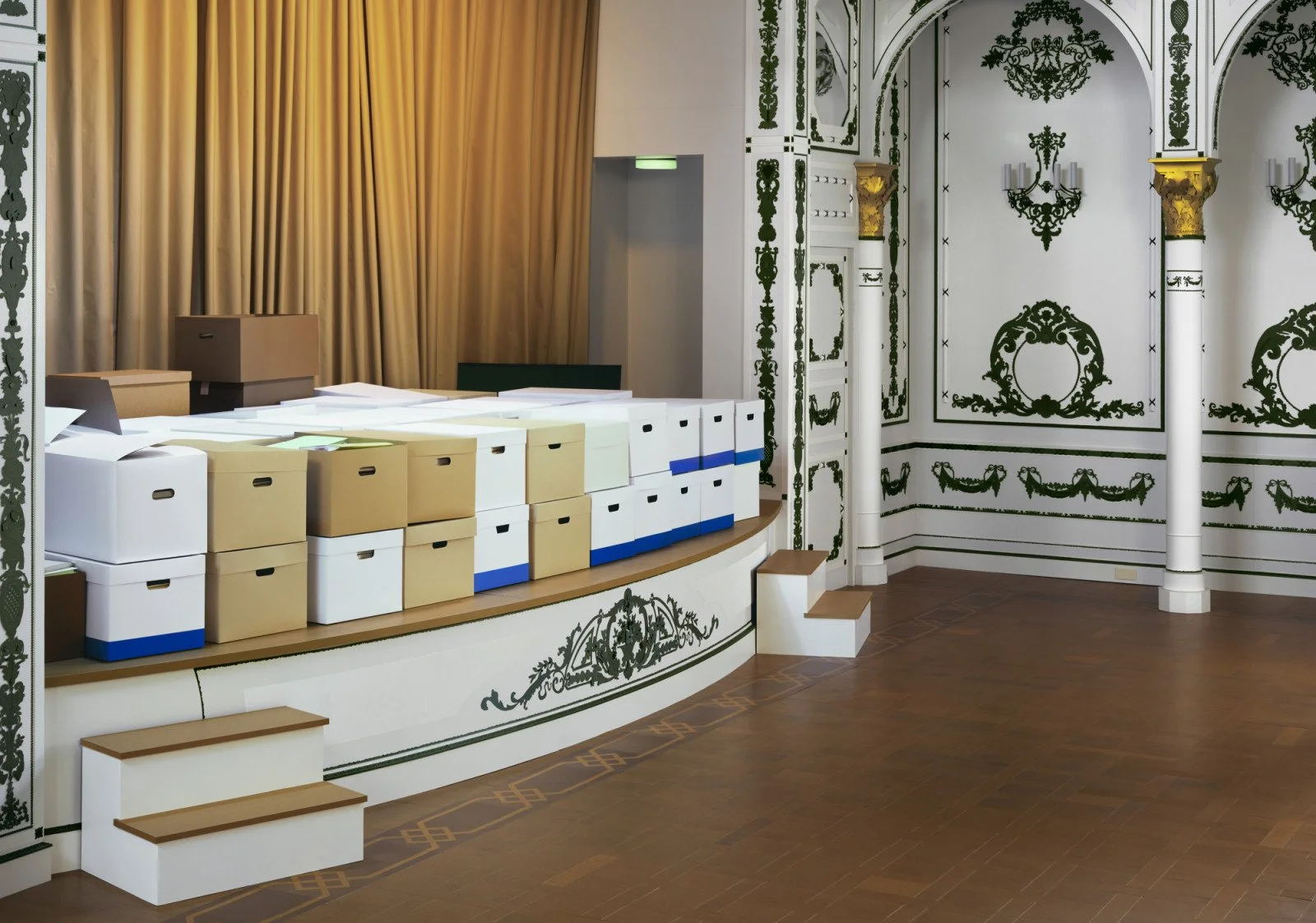 “Ballroom” (2025) revisits a photograph released by the United States Justice Department in 2023 showing boxes of haphazard classified documents which held details of potential U.S. nuclear weapons programs and military attacks stacked up on a stage in a Mar-a-Lago ballroom. Demand’s paper details of the room’s decorative wall moldings and inlaid wood flooring could be considered a form of trompe l’oeil, and the irony that this is a visual deception, in this of all locations, is not lost. In “Ballroom” we see a carefully created image that mediates a news photo--- a picture snapped to quickly document--- a sloppy piling up of things in an empty room becomes uniform boxes stacked in neat rows across the stage.