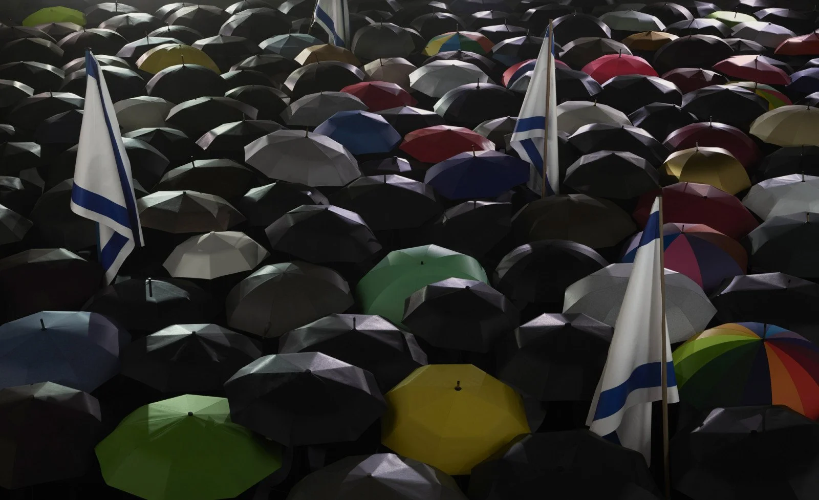 The large-scale UV print “Demonstration” (2023) shows a sea of umbrellas interspersed with Israeli flags, likely inspired by news photos of a 2023 protest in Tel Aviv’s Habima Square surrounding Prime Minister Netanyahu’s attempts to weaken Israel’s Supreme Court. Compared to the news photos of the march online, Demand creates a more painterly version of things: the light in his image spills downward from the top of the frame, as if the procession were marching out of darkness towards its source. Soft diagonals run through the composition, giving it a sense of harmonious movement. Unlike its source image, Demand’s interpretation shows no indication of rain. Eschewing figurative representation, the umbrella acts as stand-in for both the collective and the individual. While the frame teams with classic black canopies, the occasional red, yellow, blue, or rainbow umbrella stands out.