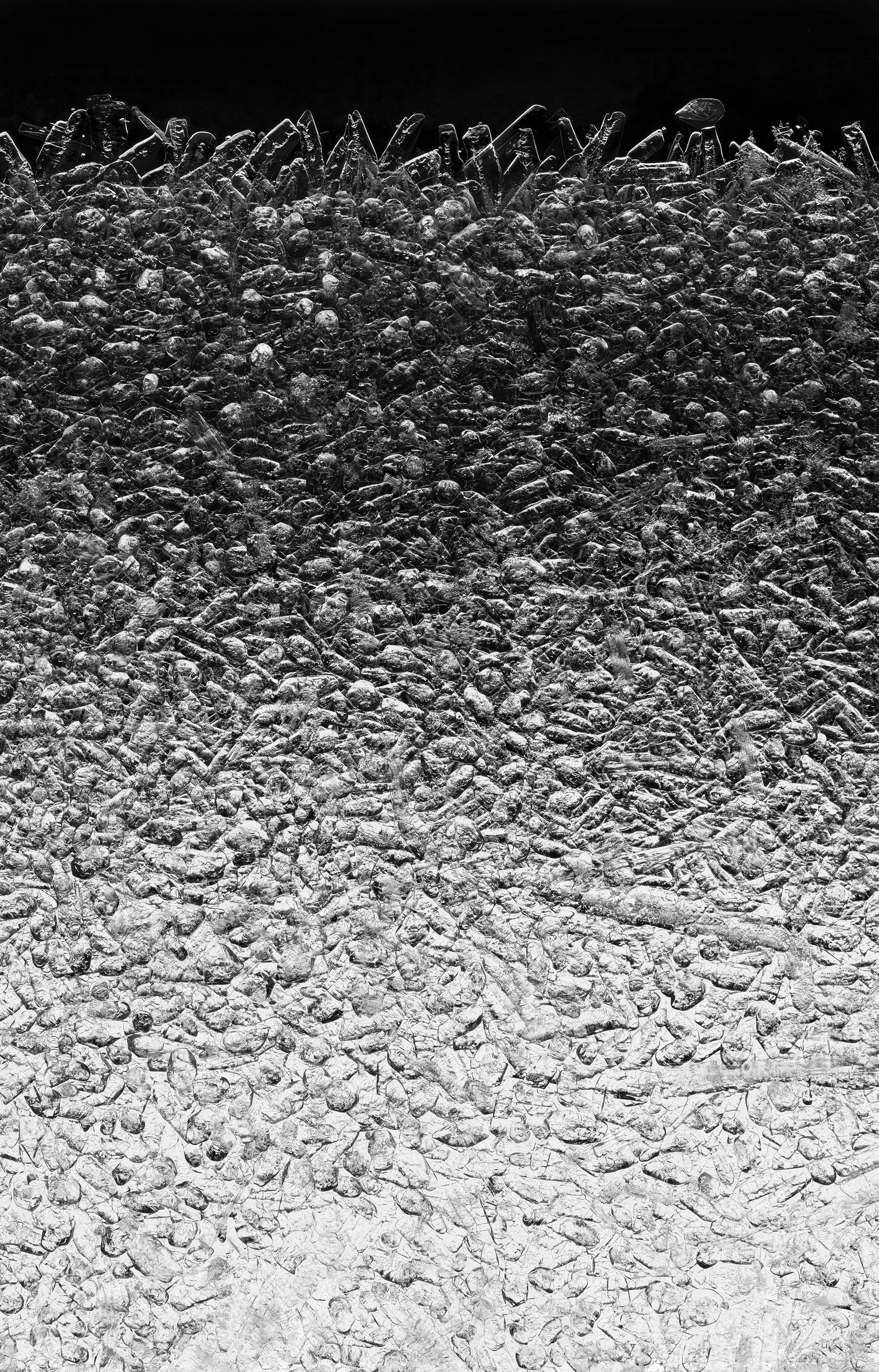 Focusing on material histories, the work of Christine Lorenz (Pittsburgh) and Juan Orrantia (Rochester) delineate the moment when an object's or material's biography becomes the image. Each artist presents distinct bodies of work where the subjects of their photographs become integral to the image. Lorenz uses macro photography to create images like “KS-5862” (2025) that push the limits of visibility. Her subject is salt—a ubiquitous household material. For this body of work, Lorenz sourced salt from West Virginia's Kanawha River Valley, which accumulated in the region over 400–600 million years ago. Her photographs bring us into another world and document the past, with material conditions bound to place—something particularly resonant in a geologic region like Pittsburgh.