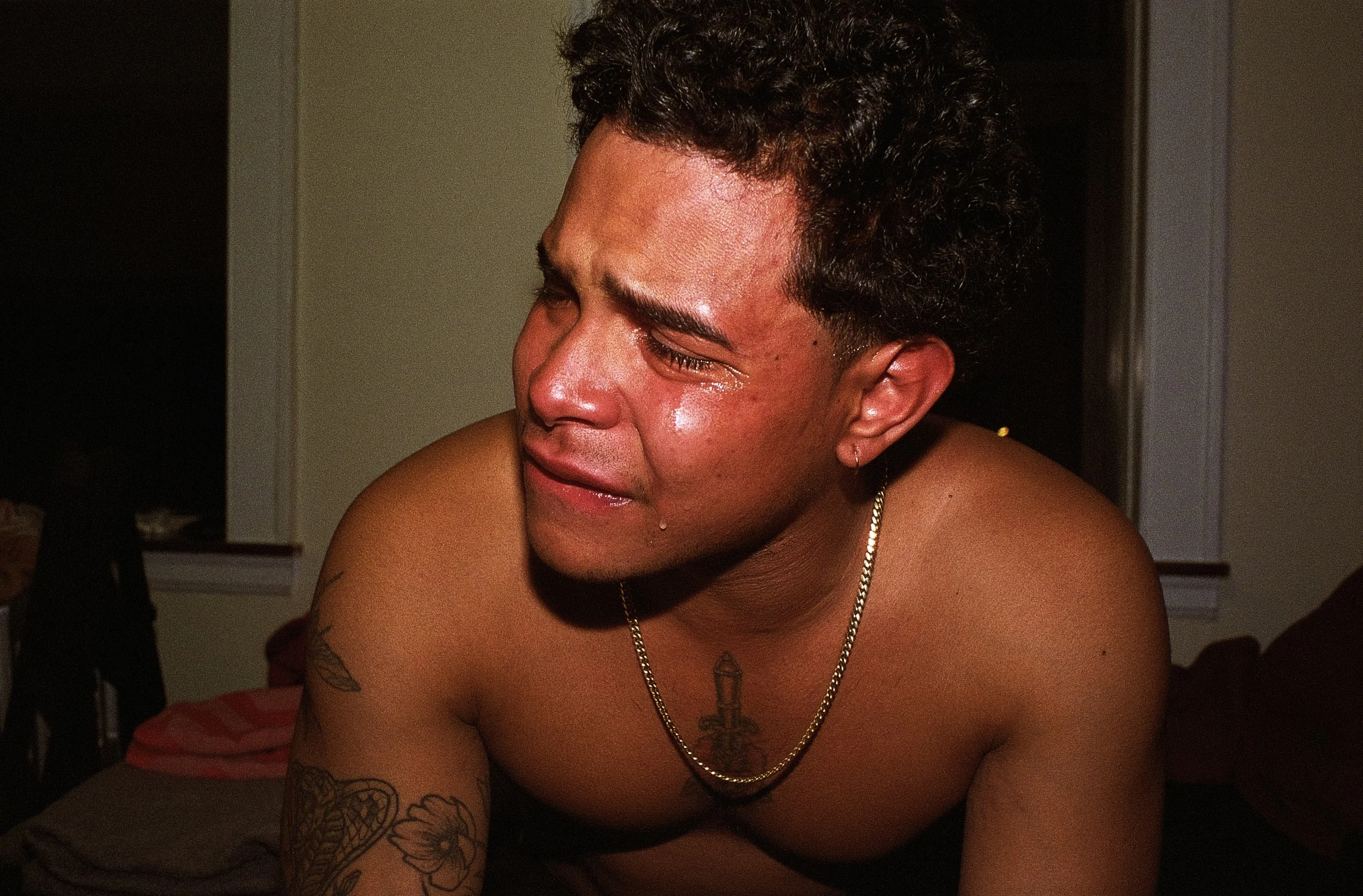 They’re raw photos—the word comes to mind—because of the way they’re shot, often with available light casting the subjects’ skin in orange or blue; soft focus, grainy, often with a slight blur. But also raw the way they seem to depict their subjects in vulnerable moments; “cj sleeping (woodstock)”, a white bundle on a grimy floor behind two flipped chairs; “ivan crying in my bedroom” closes in on a guy full sob. Hung to the left is “rissa (battered)”, a woman leaning her head onto her arm, her eye black and the bandage soaked through. Raw because they feel unfiltered.