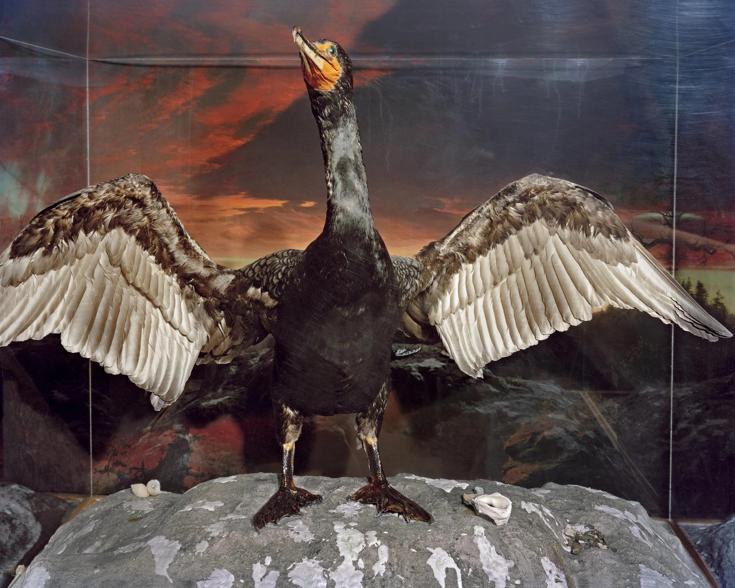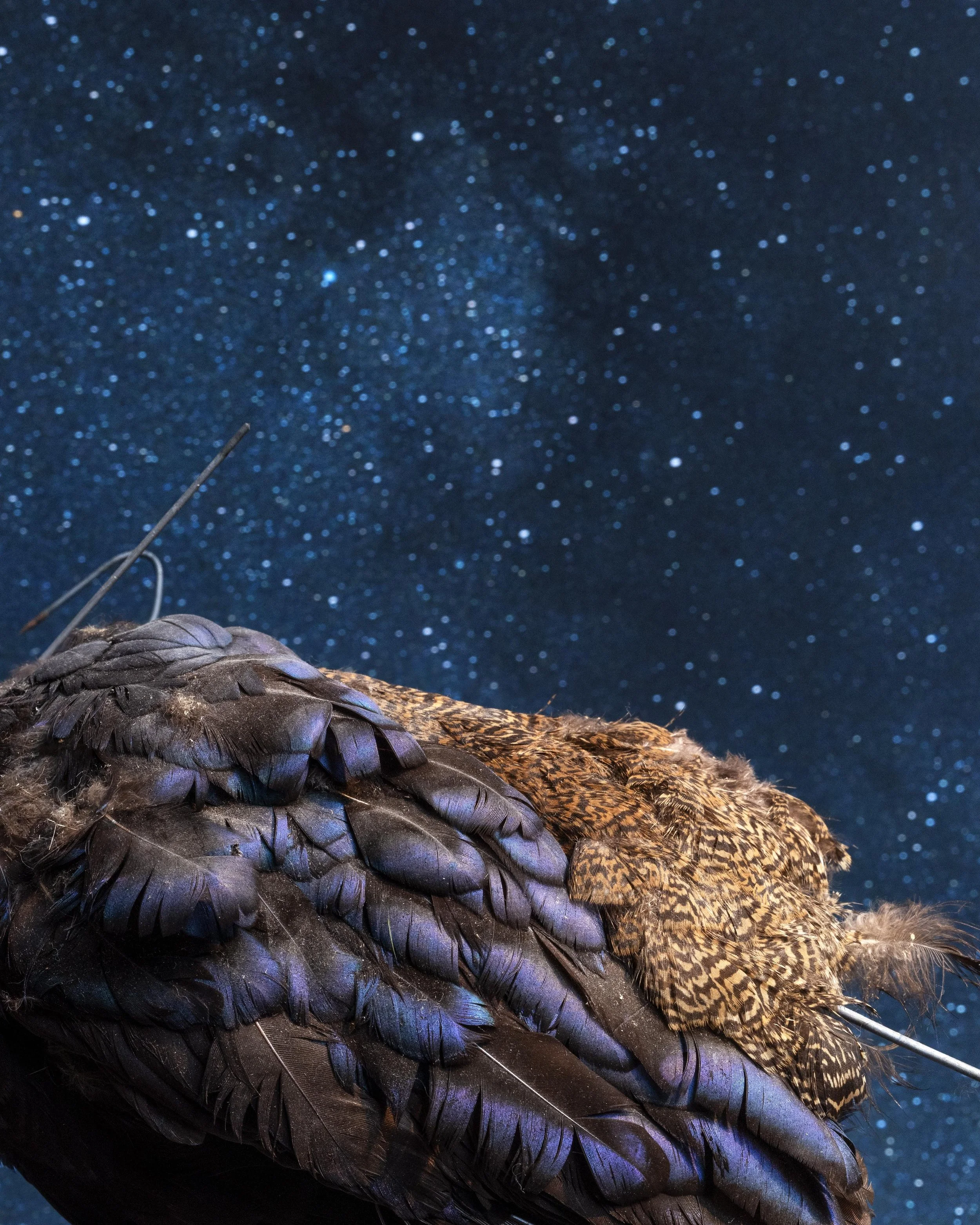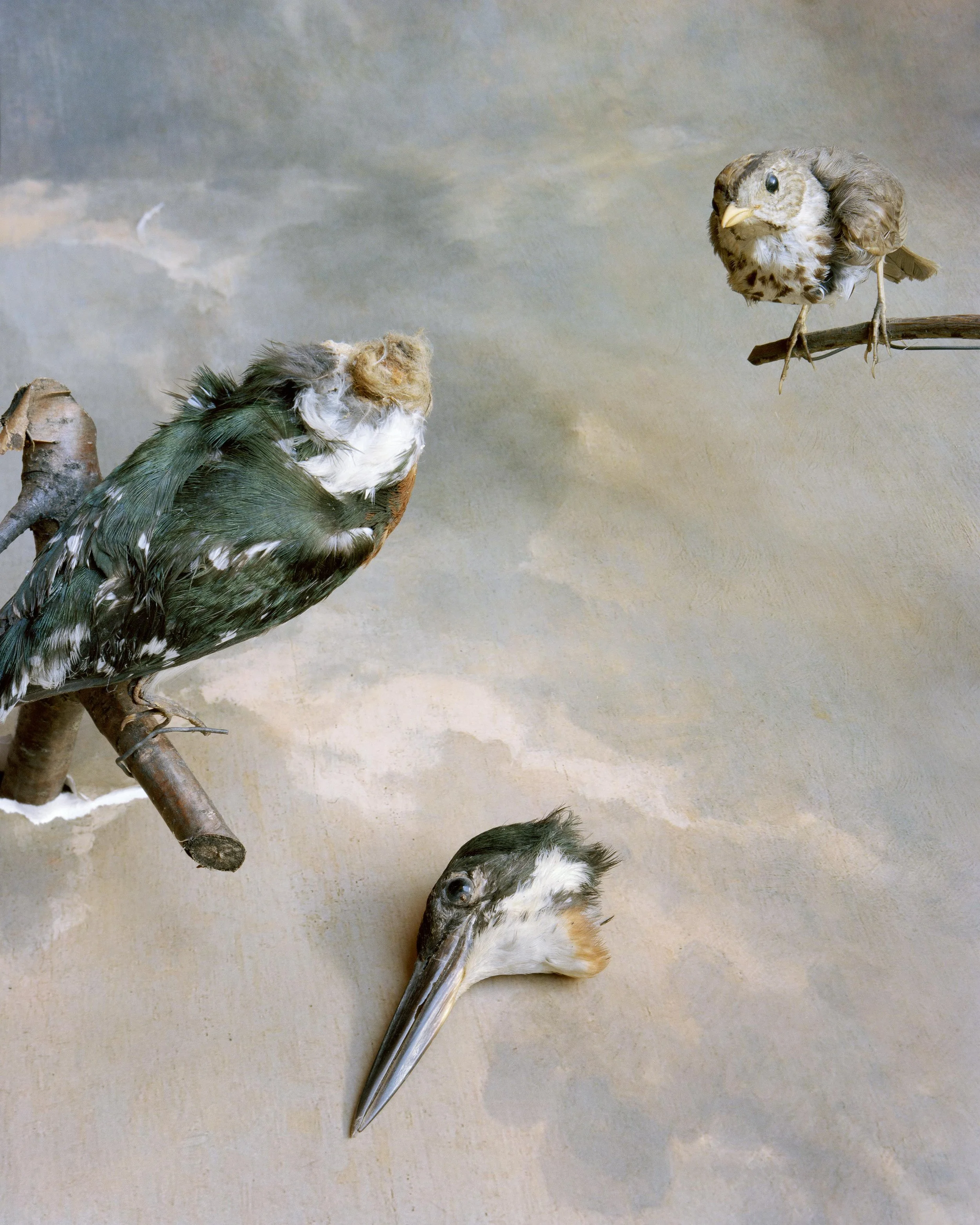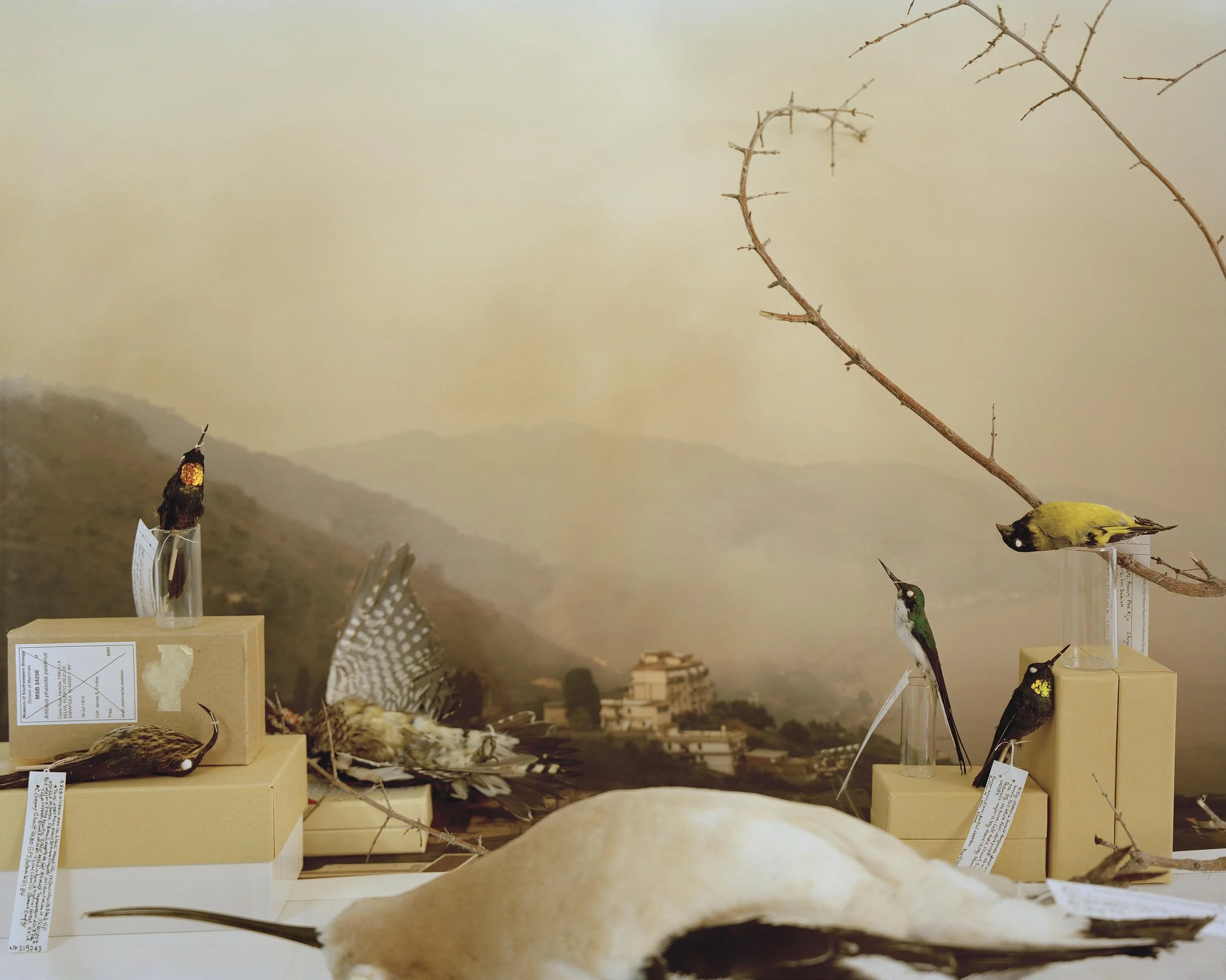 In "Glass Eyes Stare Back", I nod toward the precarity of our damaged ecosystems and my fears about environmental catastrophe by looking closely at the eerie magnetism of preserved animals. To make my images, I position specimens and printed backdrops before my camera to construct still life tableaus that I call fictional habitat dioramas. Some of the backdrops contain imagery of wildfire-smoke-filled skies or Hudson River School paintings that romanticize and fictionalize the landscape. These images demonstrate not only my fear about our environmental futures, but also a sense of sublime awe about the mystery of what’s to come.
