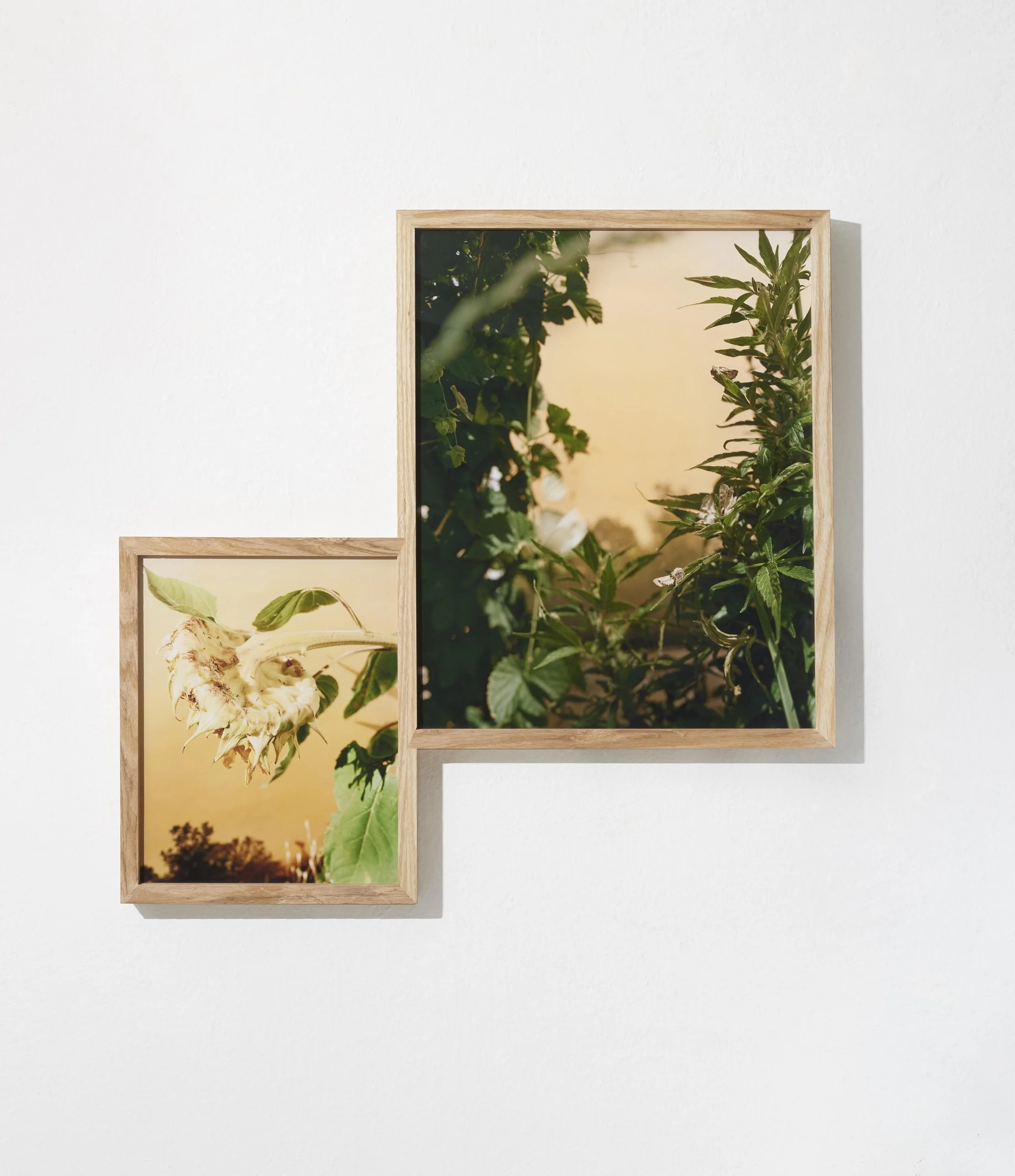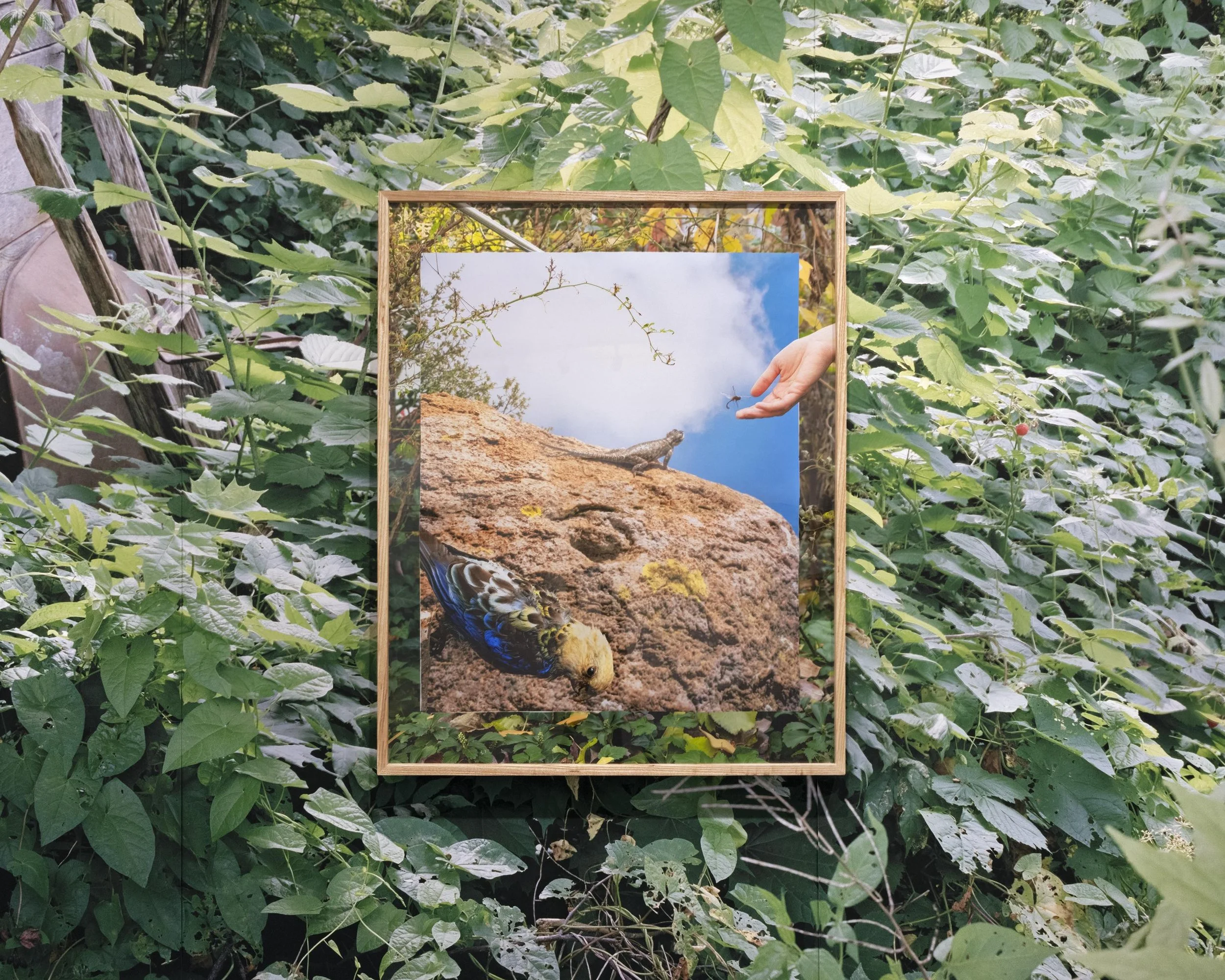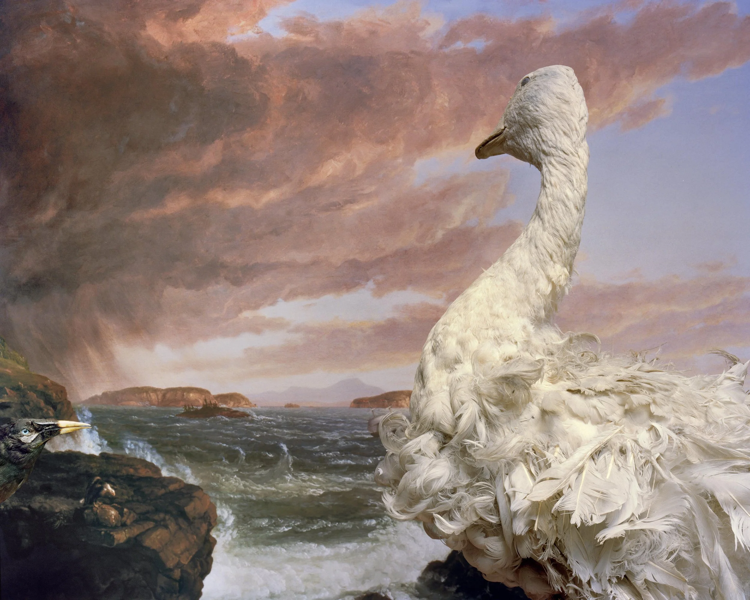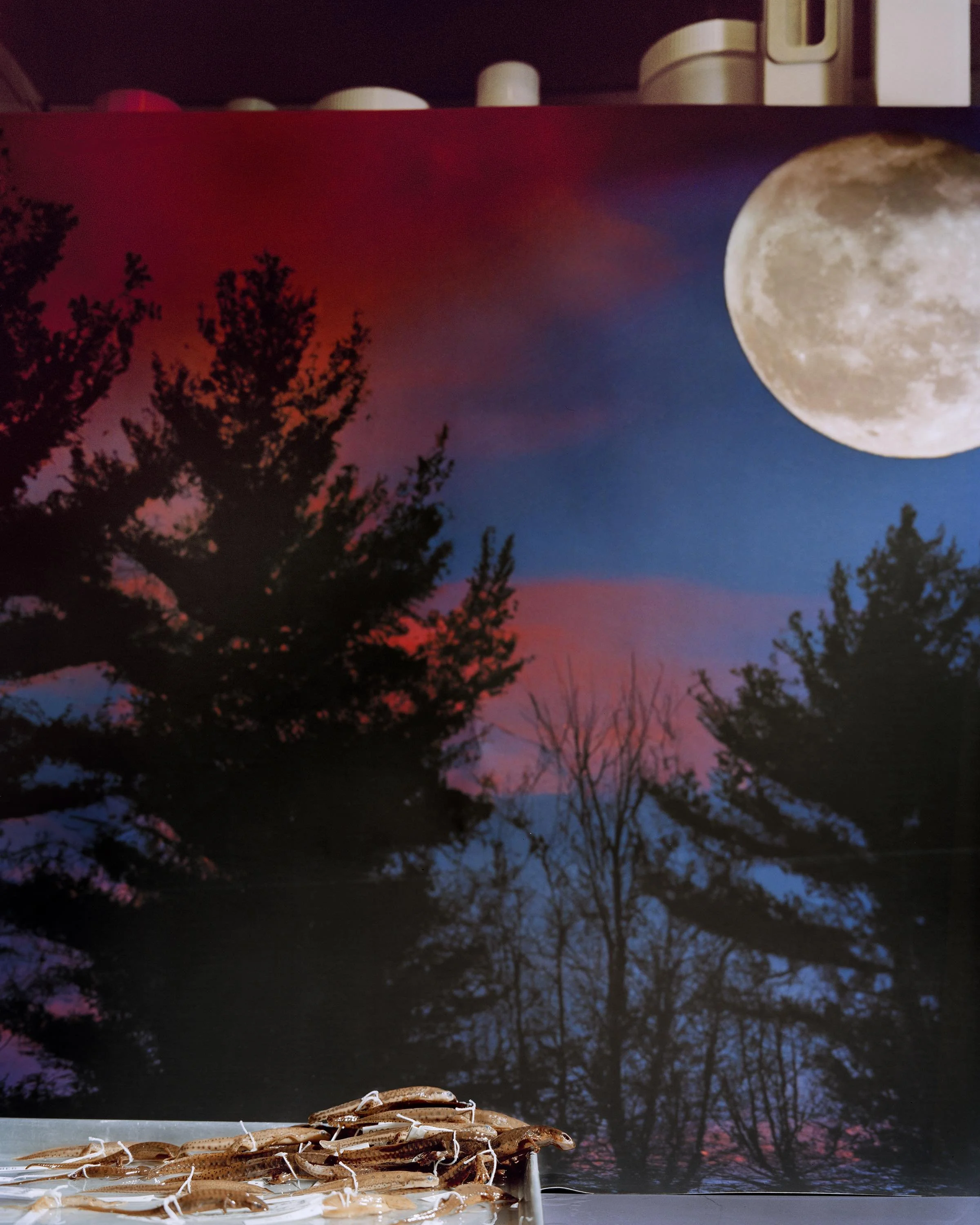 In "Glass Eyes Stare Back", I nod toward the precarity of our damaged ecosystems and my fears about environmental catastrophe by looking closely at the eerie magnetism of preserved animals. To make my images, I position specimens and printed backdrops before my camera to construct still life tableaus that I call fictional habitat dioramas. Some of the backdrops contain imagery of wildfire-smoke-filled skies or Hudson River School paintings that romanticize and fictionalize the landscape. These images demonstrate not only my fear about our environmental futures, but also a sense of sublime awe about the mystery of what’s to come.