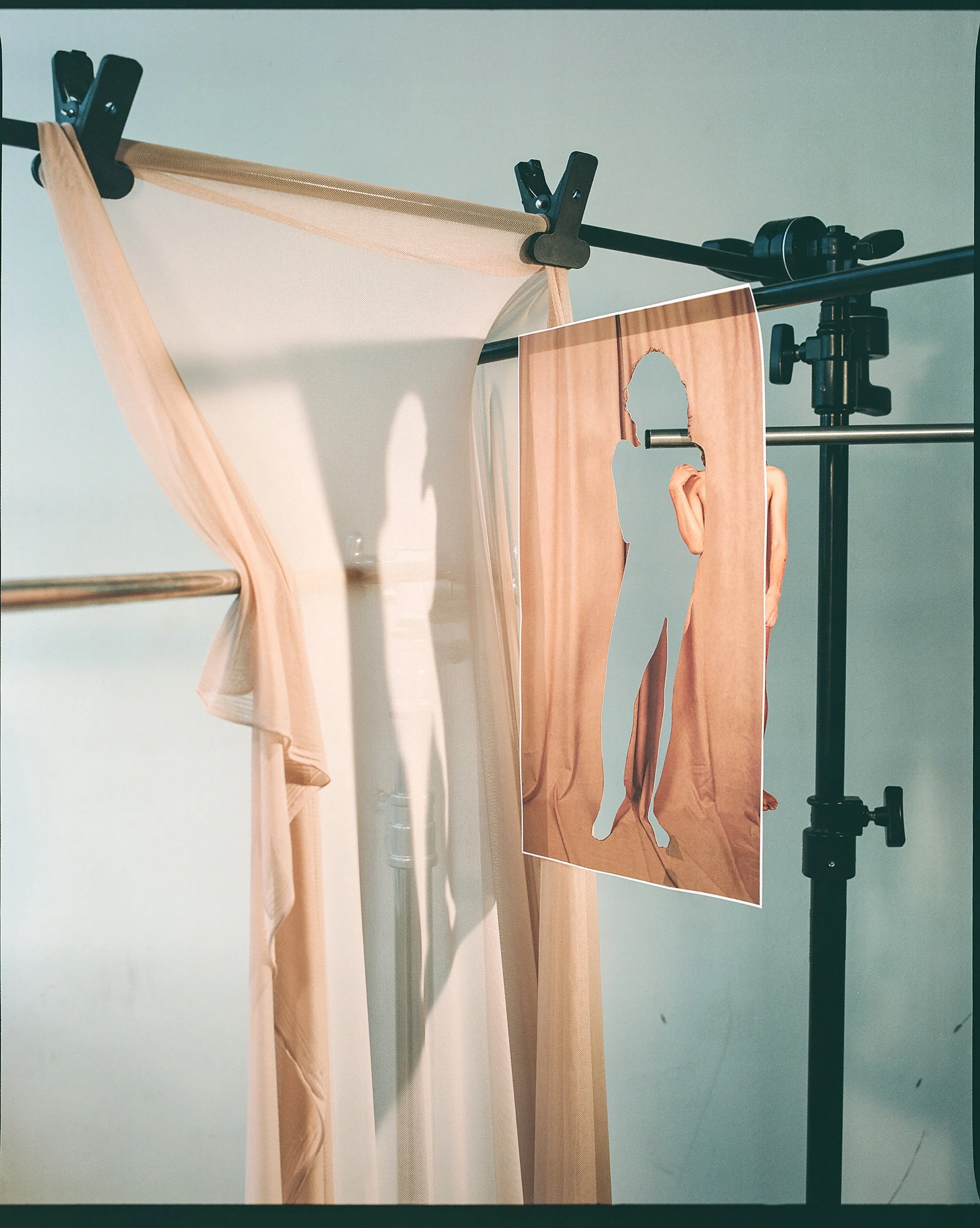 As with many artists, the pandemic necessitated a turn inward. I began to consider the bounds of photography and how I could continue to make photo based portrait work without in person interaction with my subjects. This question resulted in what has become my current process; sourcing iPhone self-portraits from subjects, which I print onto xerox paper, and then cut out and transform into collaged, layered, sculptural environments. The environments are photographed with a medium format film camera, creating a beautiful juxtaposition between hyper contemporary and more traditional photographic methods.