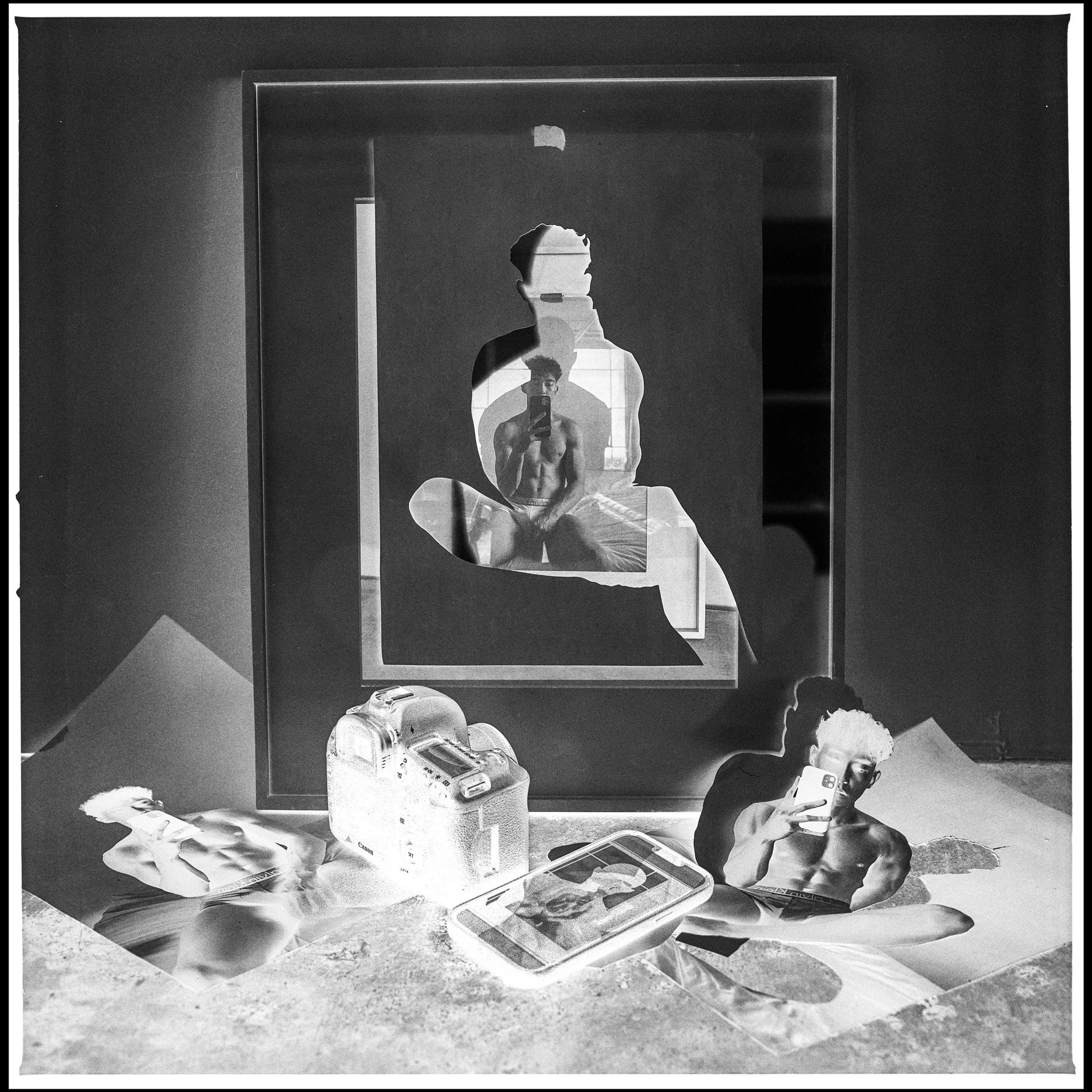 The work is as much about the imagery as it is exploring the intricate layers of social interaction, the fragility of relationships, and the impact of mental health. My personal struggles with mental health, coupled with the challenges of initiating, nurturing, and maintaining friendships, resonate deeply throughout the work. While making this work I lost two friends and an ex-partner to suicide. I view the layers in these works, both negative and positive, as a metaphor for the layers of a person that often remain hidden beneath the surface. What interests me most about them, is the fact that I've never met any of these men. This furthers the conversation surrounding the significance of online relationships and their impact on our understanding of human connection.