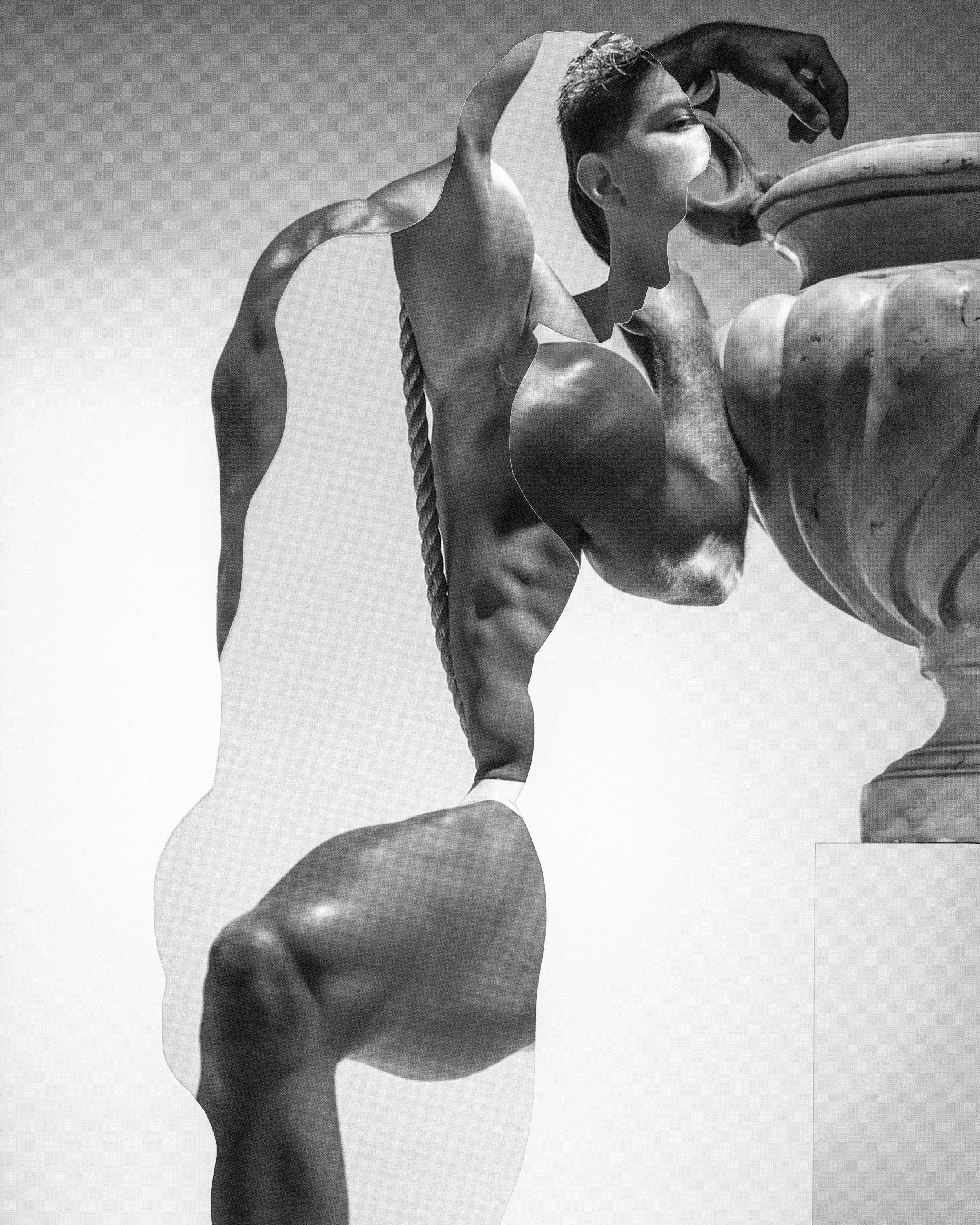 "Hidden Glances" reframes vintage gay pornographic calendars into layered analog collages where absence is as charged as presence. By splicing and re-photographing figures and scenes both originating from the same calendar published before coming out, I create negative spaces that echo the covert ways I learned to see as a closeted youth. This manipulation collapses time in the past and turns images once meant for consumption into a meditation on identity, concealment, and visibility. Disrupting the calendars’ original narratives, the series suggests how queer histories and truths are pieced together from fragments and omissions, inviting viewers to consider the shifting negotiations of desire, shame, and self-preservation.