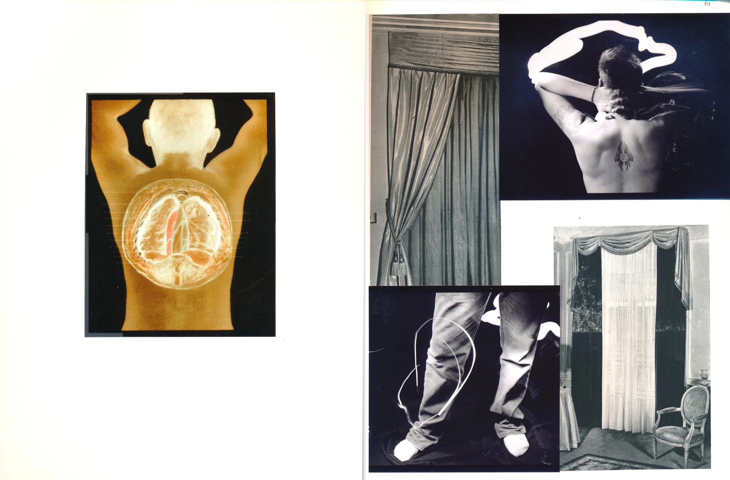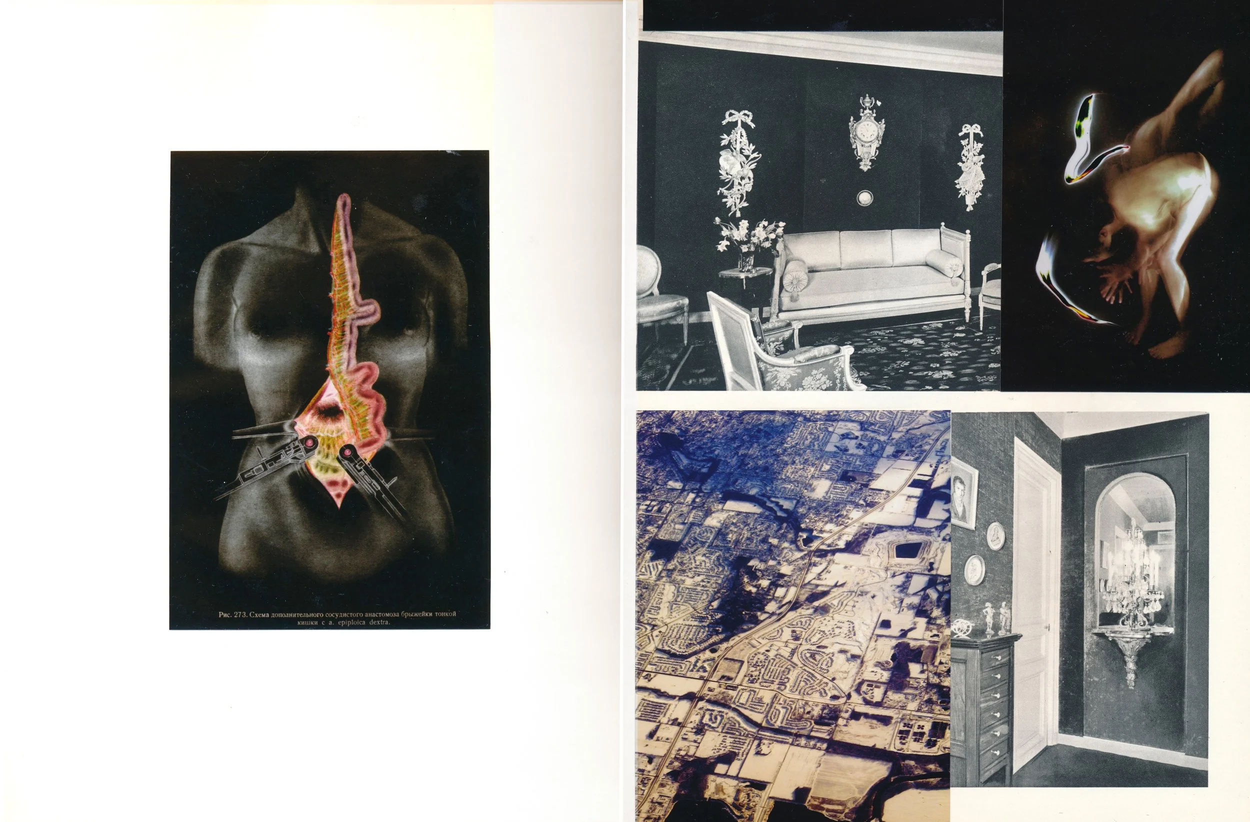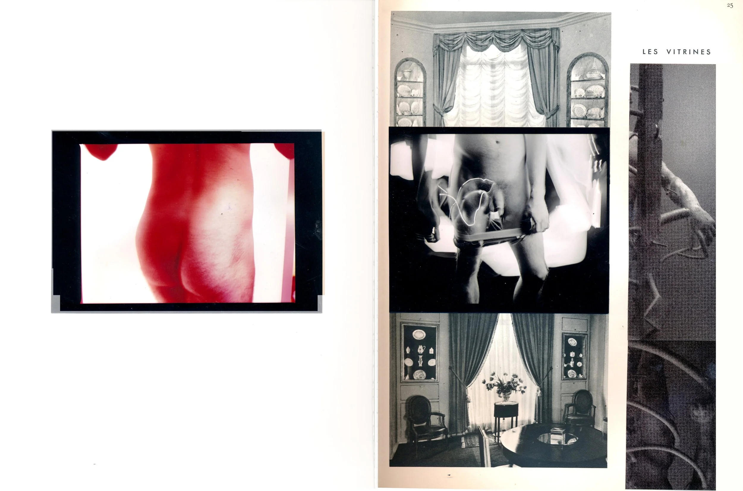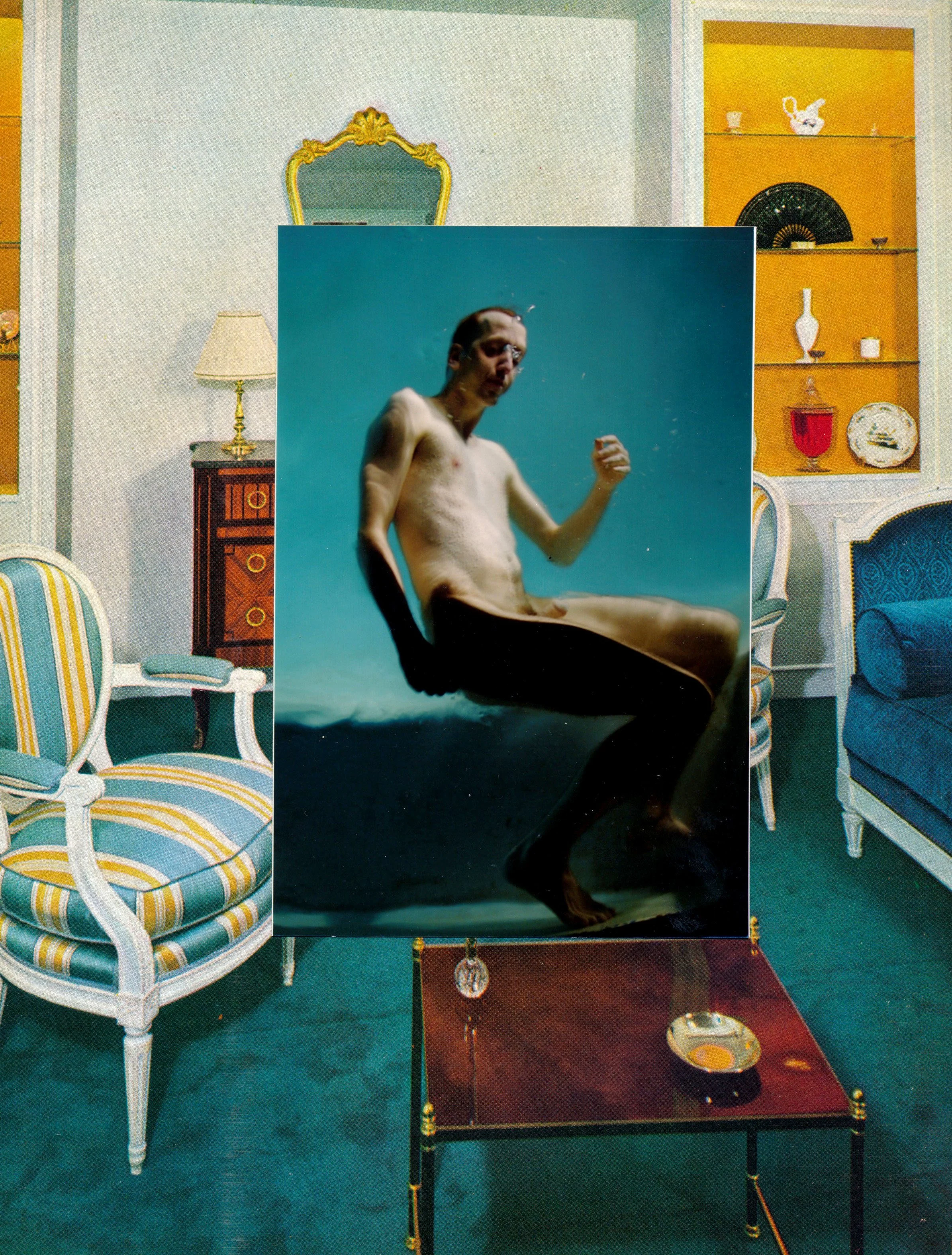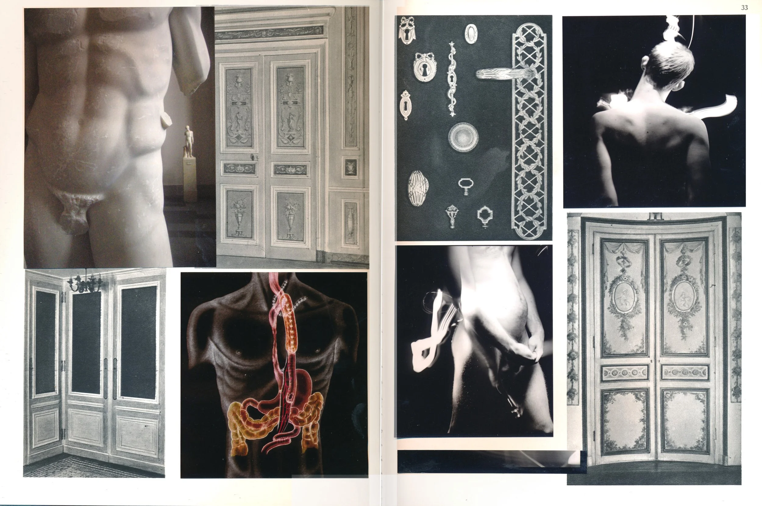 "Interiors" is a photo/collage intervention in a copy of "Comment Installer Son Intérieur en Louis XVI", France 1963, found in a used bookstore. The entire book is used as a springboard/collage base for multiple proof images from my photo series from the last 20 years. Images of the eroticized male body, abstracted landscapes from airplane flight, re-photographed anatomy charts are placed in dialog with the overwrought pretension of mid-century attempts to domesticate imperial glamor. I have used my imagery to simultaneously comment on this pomposity and eliminate nearly all text. The resulting cacophony responds to the original layouts of the book spreads, creating a one of a kind object that can barely contain the "opulence", real or imagined.