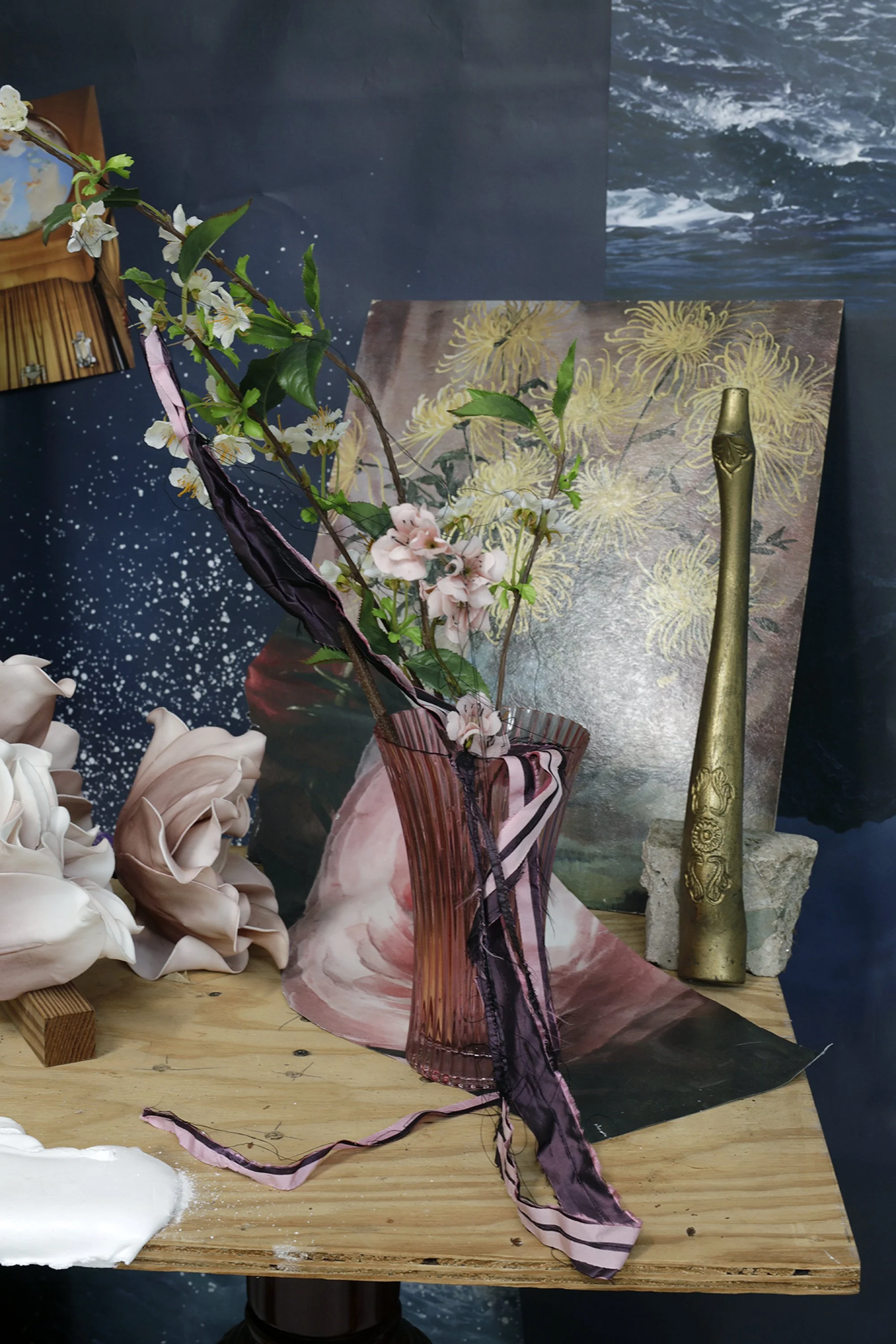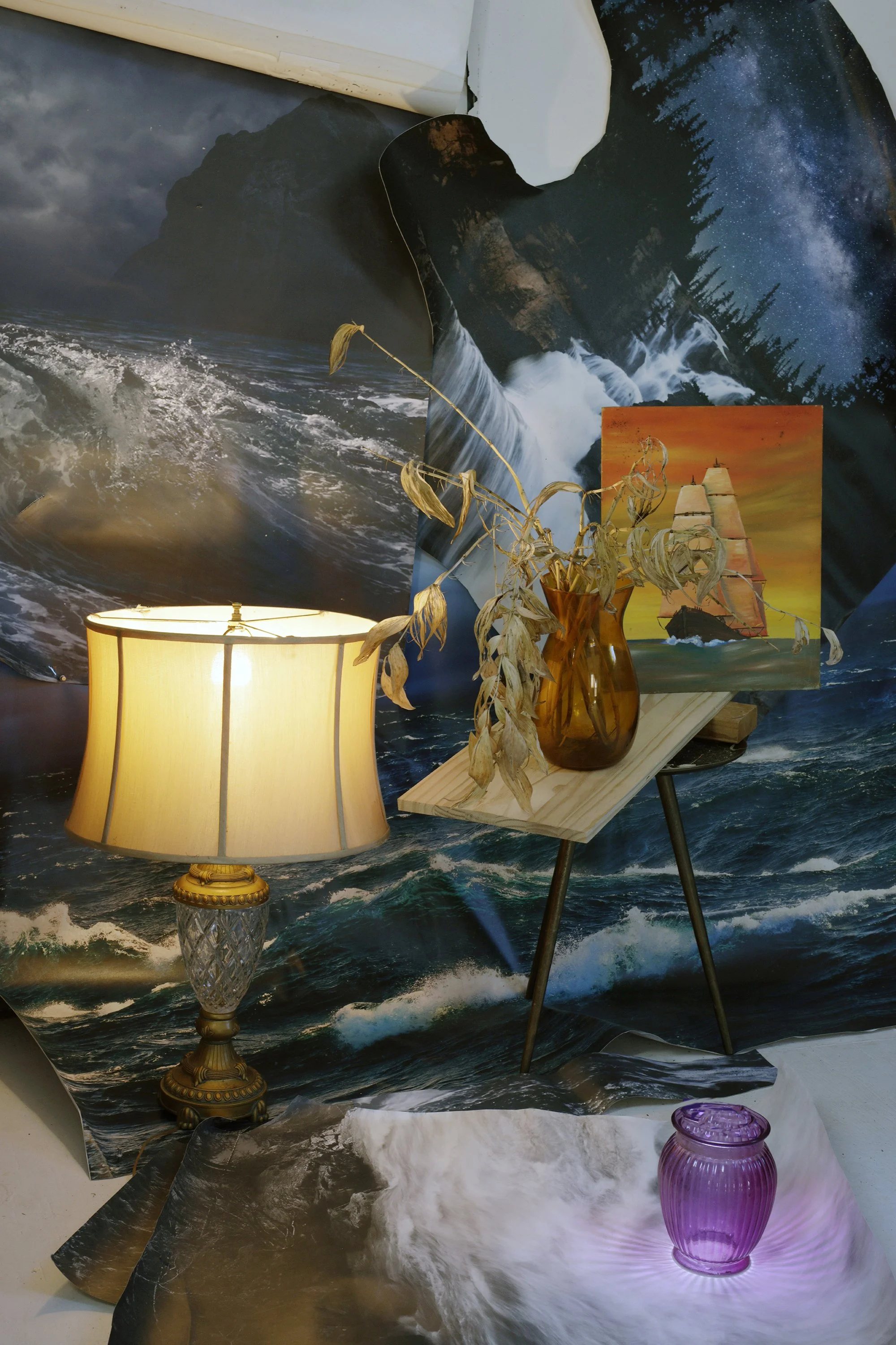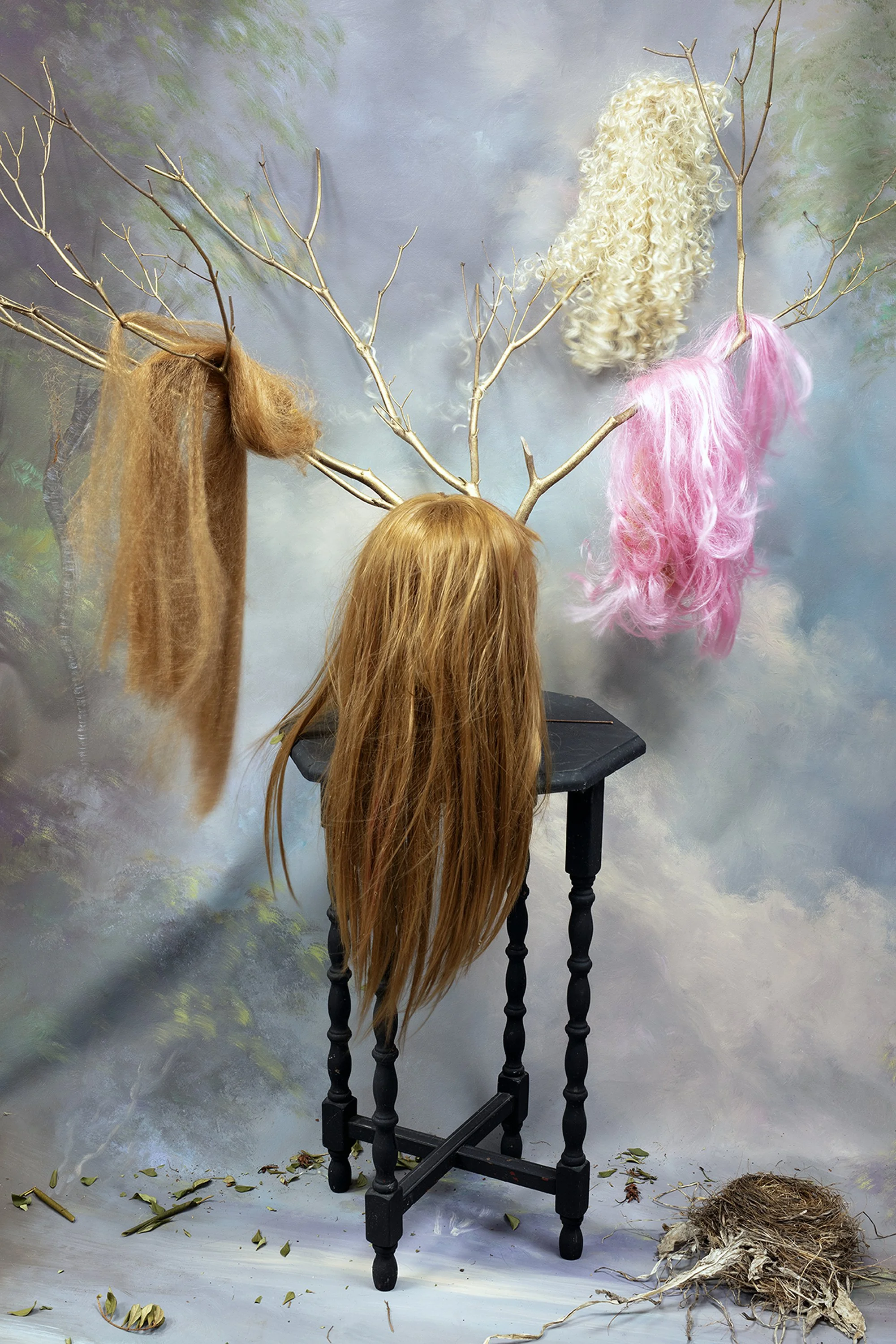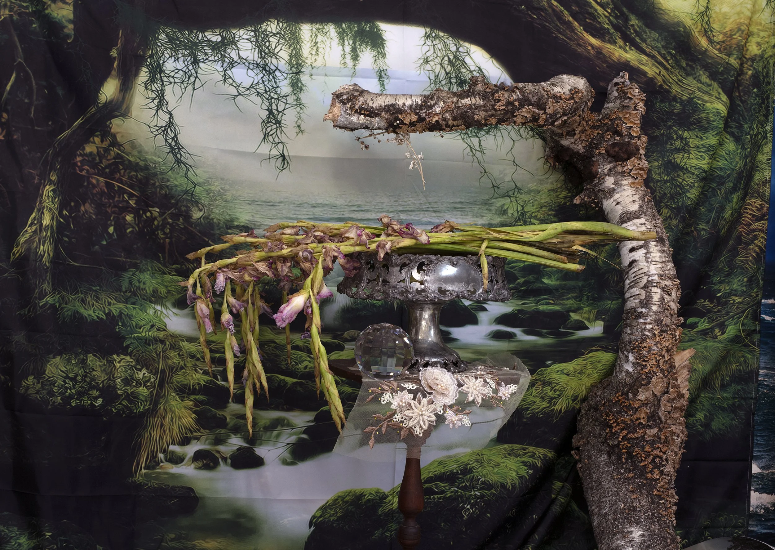 "MY BODY, MY SHELF LIFE: STILL IN LIFE". The work ranges from 2022 to 2025. Photography is the theatre of my life. Although my main interest is creating still lifes in landscapes, my physical health often intrudes and disrupts. This parallels my interest in disrupting the traditional still life genre. Many of my photographs are portraits of my 73 year old self with a desire to become part of nature again, no matter how chaotic. The unpredictability of the forces of nature is a constant drumbeat and very appealing to me. Working exclusively in the studio while referencing The Great Outdoors with the backdrops I choose, I construct theatrical still lifes referencing myths, self-portraiture, and historical still lifes; painted and photographic, and contemporizing them with humor and theatrical flair. Photography uniquely captures the collision of intentionality and chance.